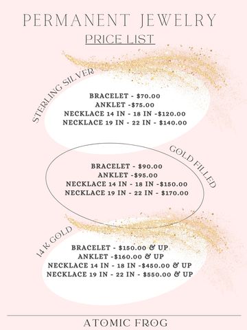 What is permanent jewelry? Permanent jewelry is welded together end-to-end, opposed to traditional clasps, giving it a seamless look. Each piece is sized according to our clients desired fit. We offer a variety of high end metals and charms. Stainless steel, gold filled and 14k gold options. We also offer jewelry with clasps for your little ones to get a matching piece as well. Atomic Frog is family oriented, and your family is always welcome. Come By & See Us!